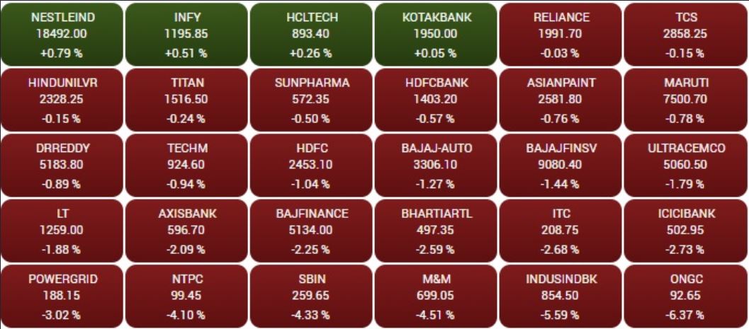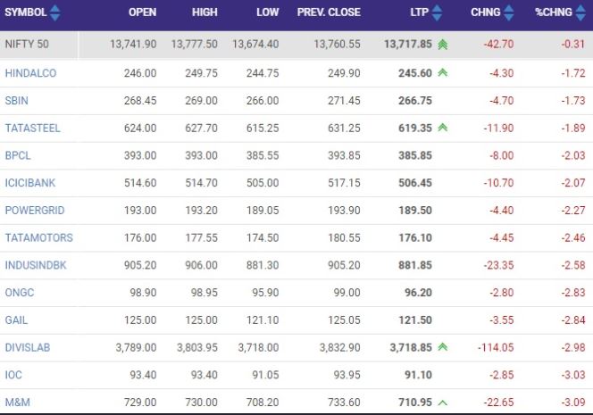 दूसरी ओर, निफ्टी 227.45 अंक नीचे 13,533.10 पर कारोबार कर रहा है। बाजार में निफ्टी बैंक इंडेक्स 801 अंक नीचे 29,913 पर कारोबार कर रहा है। इसमें फैडरल बैंक का शेयर 6% नीचे कारोबार कर रहा है। वहीं, IT सेक्टर में तेजी है। इसके अलावा निफ्टी मेटल इंडेक्स 3% नीचे कारोबार कर रहा है। इंडेक्स में हिंदुस्तान कॉपर का शेयर 7% से ज्यादा की गिरावट के साथ कारोबार कर रहा है। सुबह BSE सेंसेक्स 28.51 अंक नीचे 46,932.18 पर और निफ्टी 18.65 अंक नीचे 13,741.90 पर खुला था।