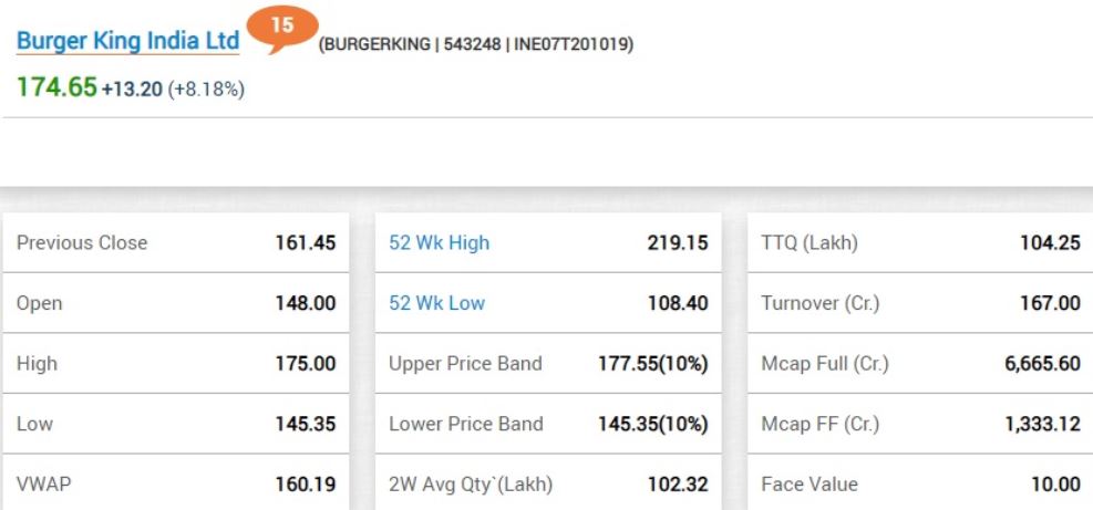 12:48 PM BSE में बर्गर किंग का शेयर 8.18% ऊपर 174.65 रुपए के भाव पर कारोबार कर रहा है।