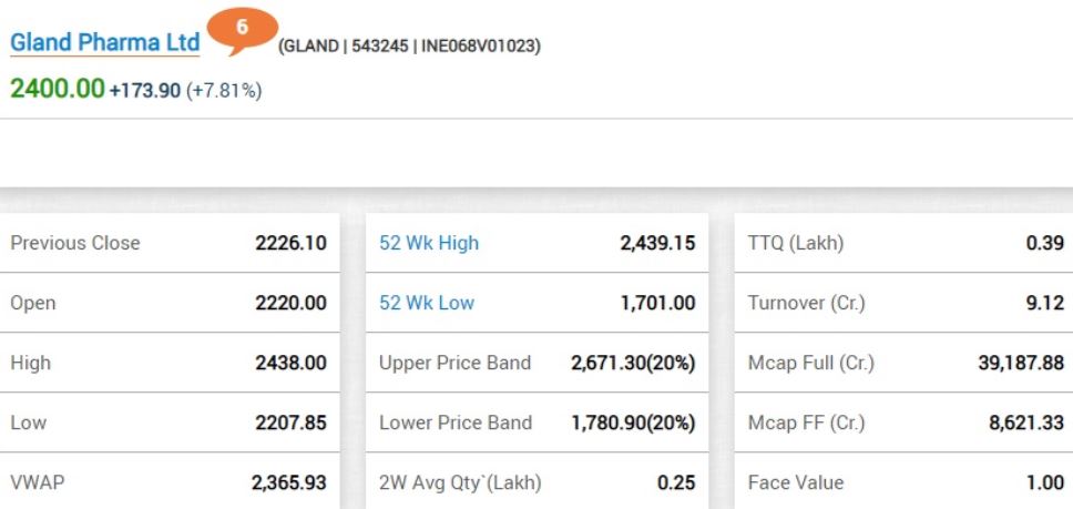 10:47 AM BSE में ग्लैंड फार्मा का शेयर 7.81% ऊपर 2400 रुपए के भाव पर ट्रेड कर रहा है।