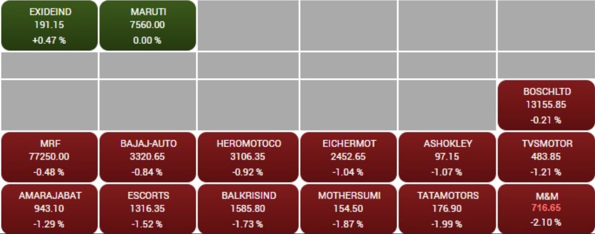 09:52 AM BSE ऑटो इंडेक्स में शामिल 15 में से 13 ऑटो कंपनियों के शेयर गिरावट के साथ कारोबार कर रहे हैं। इसमें M&M का शेयर 2% नीचे कारोबार कर रहा है। सूत्रों के मुताबिक कंपनी ट्रैक्टर सेगमेंट में कीमतें बढ़ा सकती है और यह 1 जनवरी से लागू होगी। ऐसे में शेयर में गिरावट में कारोबार कर रहा है। वहीं, मारुति और एक्साइड इंडस्ट्रीज के शेयर हल्की बढ़त के साथ कारोबार कर रहे हैं।