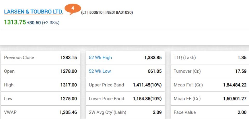 09:44 AM लार्सन एंड टर्बो लिमिटेड का शेयर 2.38% ऊपर 1313.75 रुपए के भाव पर कारोबार कर रहा है। NSDL ने कंपनी में फॉरेन पोर्टफोलियो इन्वेस्टमेंट (FPI) की सीमा को 49% से बढ़ाकर 74% कर दिया है।