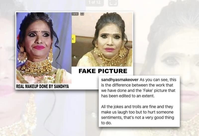 मेकअप आर्टिस्ट ने कहा, ''आप दोनों तस्वीरों को देख सकते हैं. एक तस्वीर वो है, जिसमें हमने महनत की और दूसरी वो फोटो जिसको एडिट करके तैयार किया गया. उन पर सारे जोक्स और ट्रोल्स ठीक हैं. हमें भी देखकर हंसी आई, लेकिन दूसरे को ठेस पहुंचाकर हंसना गलती है. हमें उम्मीद है आपको समझ आएगा कि असली फोटो और फेक फोटो में क्या बदलाव है. हम सिर्फ यही कहना चाहते हैं.''