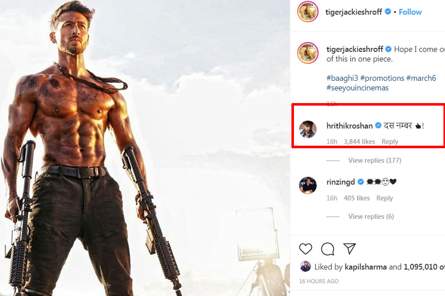 टाइगर की ये तस्वीर बॉलीवुड एक्टर ऋतिक रोशन (Hrithik Roshan) को काफी पसंद आई है। ऋतिक रोशन ने टाइगर की तस्वीर पर कमेंट करते हुए लिखा, 'दस नंबर'। टाइगर के फैंस को भी उनकी ये तस्वीर खूब पसंद आ रही है।