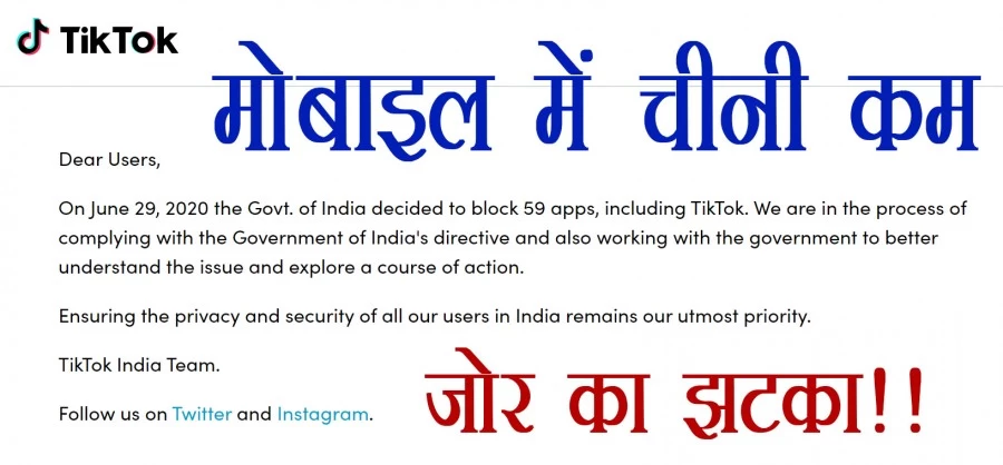 जयपुर | 59 चीनी एप बैन करने से मोदी सरकार की डिजिटल स्ट्राइक इतनी भारी पड़ी है कि टिकटॉक समेत तमाम बड़ी एप कंपनियों को रास्ता नहीं मिल रहा है। भारत के लोगों ने अब यह तय कर लिया है कि उनके मोबाइल में अब 'चीनी कम' ही रहेगी। इसी बीच कभी अमेरिका के बड़े—बड़े सोशल प्लेटफार्म को फेल करने का दावा करने वाली टिक टॉक के मालिक घुटनों पर आ गए हैं, यही नहीं उन्होंने अपनी की है कि उन्हें ट्विटर और इंस्टा पर फॉलो किया जाए। साथ ही अपने ट्विटर और इंस्टा लिंक भी बैकलिंक में प्रोवाइड कराए हैं। आपको बता दें कि टिकटॉक एक चीनी एप हैं और चीन में इंस्टाग्राम, ट्विटर जैसी वेबसाइट्स नहीं चलतीं। ऐसे में उनकी अपील ने चीन को अपनी औकात साफ तौर पर दिखा दी है।