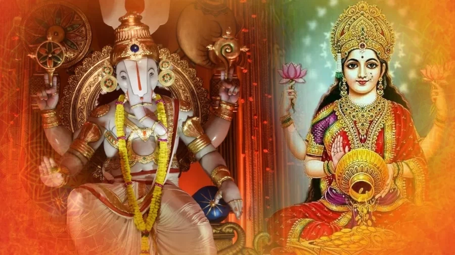 - कलश के दाहिनी ओर दक्षिण-पश्चिम दिशा में भगवान गणेश की मूर्ति या फोटो तथा बीच में देवी लक्ष्मी की मूर्ति या तस्वीर रखें. छोटी थाली पर चावल का छोटी सी चपटी आकृति बनाएं. उस पर हल्दी से कमल का फूल डिजाइन करें, कुछ पैसे डालें तथा मूर्ति के सामने रख दें.