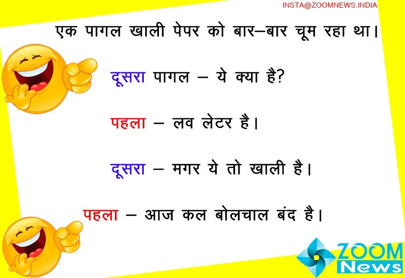 आज का जोक एक पागल खाली पेपर को बार-बार चूम रहा था। दूसरा पागल - ये क्या है? पहला - लव लेटर है। दूसरा - मगर ये तो खाली है। पहला - आज कल बोलचाल बंद है।