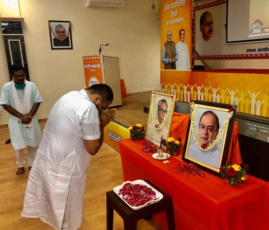 जयपुर | भाजपा प्रदेश कार्यालय में आज भाजपा के वरिष्ठ नेता व पूर्व केन्द्रीय वित्त मंत्री श्री अरुण जेटली जी की प्रथम पुण्यतिथि पर उनके चित्र पर पुष्पांजलि अर्पित कर श्रद्धांजलि दी। राष्ट्रीय सह-संगठन महामंत्री वी. सतीश, प्रदेशाध्यक्ष डाॅ. सतीश पूनियां, प्रदेश संगठन महामंत्री चंद्रशेखर एवं पूर्व प्रदेशाध्यक्ष अशोक परनामी एवं पार्टी के अन्य पदाधिकारियों ने भी स्वर्गीय अरुण जेटली जी को श्रद्धासुमन अर्पित किए। साथ ही भाजपा के वरिष्ठ नेता एवं भाजपा राजस्थान के पूर्व प्रदेश अध्यक्ष रघुवीर सिंह कौशल की पुण्यतिथि पर उन्हें श्रद्धांजलि दी।