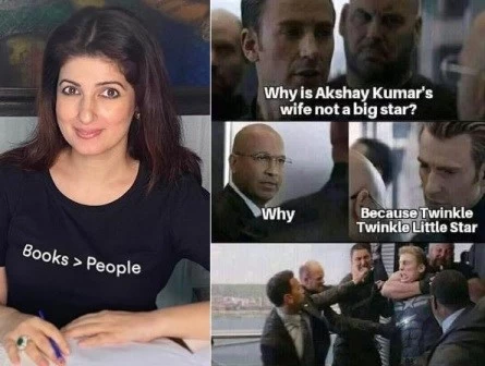 वहीं अब ट्विंकल ने इंस्टा पर एक मीम शेयर किया और बताया कि,'वह बड़ी स्टार क्यों नहीं है?' यह मीम कैप्टेन अमेरिका के फाईट सीन्स का है। जिसमें पूछा जाता है कि अक्षय कुमार की वाईफ एक बड़ी स्टार क्यों नहीं हैं और जवाब में यह पता चलता है कि ट्विंकल ट्विंकल लिटिल स्टार।' इस तरह के मीम को शेयर कर ट्विंकल खुद इस जोक को एंजॉय कर रही है।