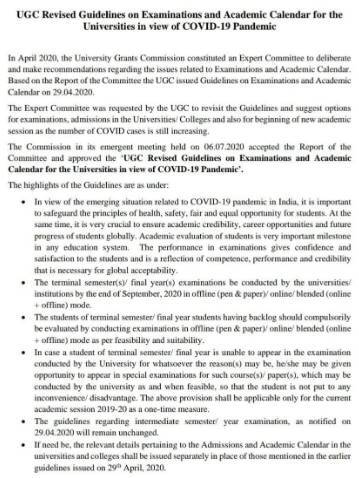 विश्वविद्यालय अनुदान आयोग (यूजीसी) द्वारा आज विश्वविद्यालयों, महाविद्यालयों, डीम्ड विश्वविद्यालयों, कॉलेजों और अन्य उच्च शिक्षा संस्थानों में विभिन्न पाठ्यक्रमों की अंतिम वर्ष या सेमेस्टर की परीक्षाओं के लिए नए दिशानिर्देश (guidelines) 2020 जारी किए गए हैं जिसके तहत यूनिवसिर्टी और कॉलेजों को फाइनल ईयर के एग्जाम आयोजित करना अनिवार्य कर दिया गया है। हालांकि, यूजीसी की गाइडलाइन्स आने से पहले ही कई यूनिवर्सिटीज ने अपने स्तर पर ही एग्जाम्स को लेकर फैसला ले लिया था वहीं कई यूनिवर्सिटी और कॉलेजों फाइनल ईयर और सेमेस्टर एग्जाम के लिए यूजीसी की गाइडलाइन्स का इंतजार कर रहे थे
