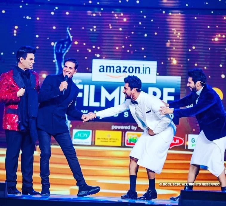 जब वे पैंट्स ढूंढ़ रहे थे तब उनके सामने ‘अक्षय कुमार’ (Akshay Kumar) बैठे नजर आए। उन्होंने थोड़ी हसी मज़ाक किया। लेकिन दोनों अभिनेता स्टेज पर टॉवल पहनकर आए तो अक्षय वहां भी पहुंच गए। दोनों ने अपने टॉवल कस कर पकड़े रखा था, लेकिन बीच में अक्षय दोनों के टॉवल भी खींचने लग जाते हैं। असल में कुछ समय बाद ‘करण जौहर’ (Karan Johar) दोनों के पैंट लेकर स्टेज पर आ जाते हैं, लेकिन वो पैंट वापस देने के लिए उनके साथ एक गेम खेलते हैं। इस बीच अक्षय दोनों की टॉवल खींचने लग जाते हैं। इस पर विक्की ये भी कहते हैं कि प्लीज अक्षय सर छोड़ दीजिए, क्योंकि मैंने तौलिए के अंदर वाकई कुछ भी नहीं पहना है।