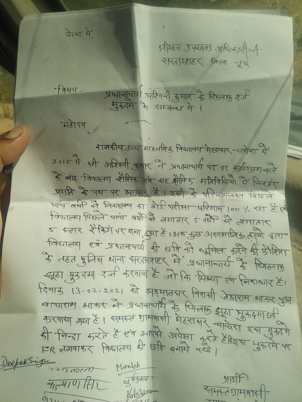 चूरू जिले के सरदारशहर तहसील के गाँव मेहरासर चाचेरा के सरकारी स्कूल के प्रधानाचार्य अश्विनी कुमार के खिलाफ थाने में दर्ज छात्राओं से मारपीट के मामले काे ग्रामीणाें ने एसडीएम काे ज्ञापन साैंपकर पूरे प्रकरण की निष्पक्ष जांच कराने की मांग की। ग्रामीणाें की ओर से दिए गए ज्ञापन में बताया कि गांव के राउमावि मेहरासर चाचेरा में 2015 में पदस्थापित अश्विनी कुमार की मेहनत से स्कूल का परीक्षा परिणाम पिछले पांच वर्षाें से 100 प्रतिशत रहा है। दाे दिन पूर्व कुछ लाेगाें ने प्रधानाचार्य की छवि खराब करने की काेशिश करते हुए प्रधानाचार्य के खिलाफ थाने में छात्राओं से मारपीट का झूठा मामला दर्ज कराया है। ग्रामीणाें ने मामले की निष्पक्ष जांच कर मुकदमे काे खारिज करने की मांग की है।