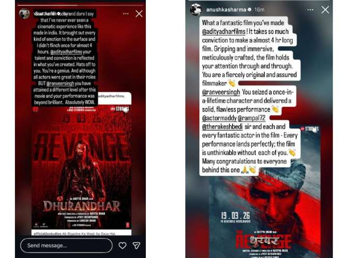 अभिनेत्री और निर्माता अनुष्का शर्मा ने भी इंस्टाग्राम स्टोरी के माध्यम से फिल्म 'धुरंधर 2' के प्रति अपना उत्साह व्यक्त किया। अनुष्का ने विशेष रूप से निर्देशक आदित्य धर के साहस की सराहना की, जिन्होंने 4 घंटे लंबी फिल्म बनाने का निर्णय लिया। उन्होंने कहा कि इतनी लंबी फिल्म बनाने के लिए बहुत अधिक दृढ़ विश्वास और स्पष्ट दृष्टिकोण की आवश्यकता होती है। अनुष्का के अनुसार, फिल्म दर्शकों को पूरी तरह से अपनी गिरफ्त में ले लेती है और भावनाओं के सागर में डुबो देती है।
