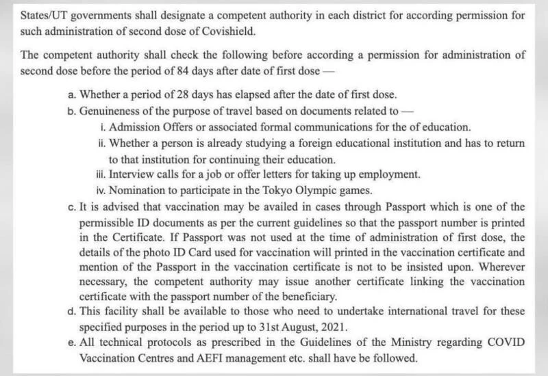 मंत्रालय की ओर से बताया गया है कि पासपोर्ट में कोविन सर्टिफिकेट के लिंक होने और वैक्सीन के टाइप में 'कोविशील्ड' का उल्लेख होना काफी होगा। इसके अलावा वैक्सीनेशन सर्टिफिकेट में किसी और एंट्री की जरूरत नहीं होगी। स्वास्थ्य मंत्रालय ने राज्यों को चिट्ठी लिखकर शिक्षा, रोजगार या टोक्यो ओलंपिक के लिए विदेश यात्रा करने वाले लोगों को जरूरत होने पर कोविशील्ड की दूसरी डोज 84 दिन होने से पहले ही देने को कहा है। मंत्रालय ने कहा है कि जिन लोगोंने कोविशील्ड की पहली खुराक ली है और उनकी यात्रा की तारीख दूसरी खुराक के लिए तय किए गए 84 दिन पूरे होने से पहले पड़ रही है, उनको पहले ही डोज दे दी जाए।