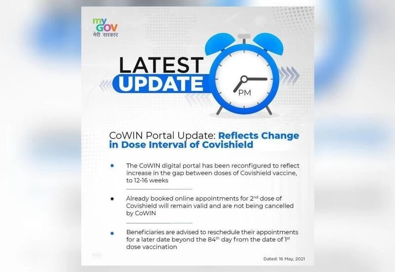 केंद्र ने 13 मई को कोविशील्ड टीके की पहली और दूसरी खुराक लेने के समय में अंतर बढ़ाकर 12-16 सप्ताह कर दिया था। मंत्रालय ने कहा, '' भारत सरकार ने इस बदलाव के संबंध में राज्यों एवं केंद्र शासित प्रदेशों को सूचित किया है। कोविशील्ड टीके की दूसरी खुराक लेने के लिये 12-16 सप्ताह के अंतराल को दर्शाने के लिए को-विन पोर्टल में भी आवश्यक बदलाव किए गए हैं।