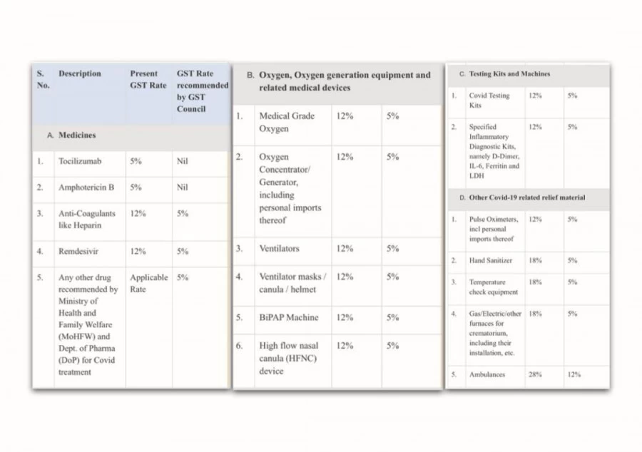 मंत्रियों के समूह या जीओएम (GoM) ने पीपीई किट, एन95 मास्क और सर्जिकल मास्क पर जीएसटी (GST) की दर 5 फीसदी और एंबुलेस पर 28 फीसदी बनाए रखने का सुझाव दिया है। कोविड-19 से जुड़ी दवाओं और मेडिकल उपकरणों जैसे मेडिकल ऑक्सिजन, ऑक्सिजन कंसनट्रेटर, वेंटिलेटर, पल्स ऑक्सीमीटर और टेस्टिंग किट्स पर जीएसटी (GST) की दर में अस्थाई तौर पर कटौती करने का सुझाव दिया है।