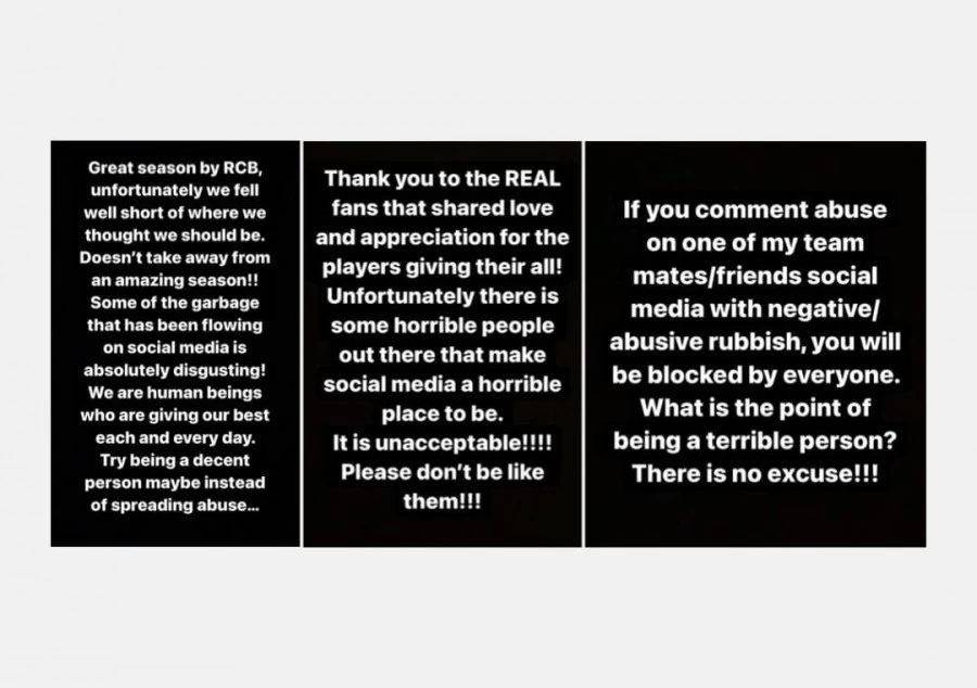 मैक्सवेल ने लिखा, 'आरसीबी के लिए यह अच्छा सीजन रहा। हम वहां तक नहीं पहुंच सके, जहां तक हमें पहुंचना था, लेकिन इससे यह बात झुठलाई नहीं जा सकती कि हमारे लिए यह सीजन अच्छा रहा। कुछ गंदगी जो सोशल मीडिया पर मची हुई है, यह देखना बहुत ही खराब है। हम सभी इंसान हैं, जो हर दिन अपना बेस्ट देने की कोशिश करता है। गंदगी फैलाने से अच्छा एक बेहतर इंसान बनिए। सच्चे फैन्स को दिल से शुक्रिया। ऐसे कुछ घटिया लोग हैं, जो सोशल मीडिया को घटिया बनाते हैं, यह स्वीकार्य नहीं है, उनके जैसा प्लीज मत बनिए।'