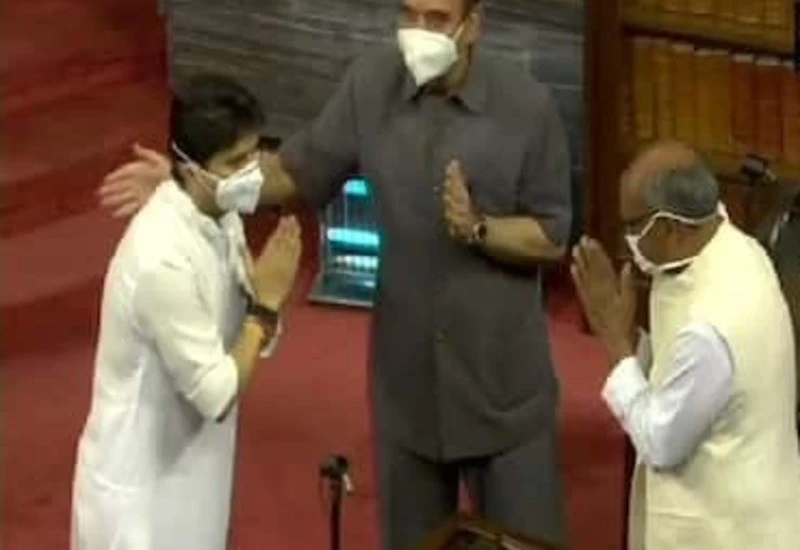 नई दिल्ली। बीजेपी नेता ज्योतिरादित्य सिंधिया (Jyotiraditya Scindia), कांग्रेस के दिग्विजय सिंह (Digvijaya Singh) समेत 44 राज्यसभा सांसदों (Rajyasabha Members) ने बुधवार को शपथ ले ली। इस बीच राज्यसभा से एक दिलचस्प तस्वीर सामने आई। जब सभी सांसद शपथ ले रहे थे तो महाराजा और राजा का आमना-सामना हुआ। बीजेपी में शामिल होने के बाद राजनीति में एक-दूसरे के विरोधी हो चुके 'महाराज' यानी ज्योतिरादित्य सिंधिया ने 'राजा' यानी दिग्विजय सिंह का हाथ जोड़कर अभिवादन किया। दोनों ने मास्क पहना हुआ था। सिंधिया ने दिग्विजय सिंह के अलावा गुलाम नबी आजाद और मल्लिकार्जुन खड़गे का भी अभिवादन किया।