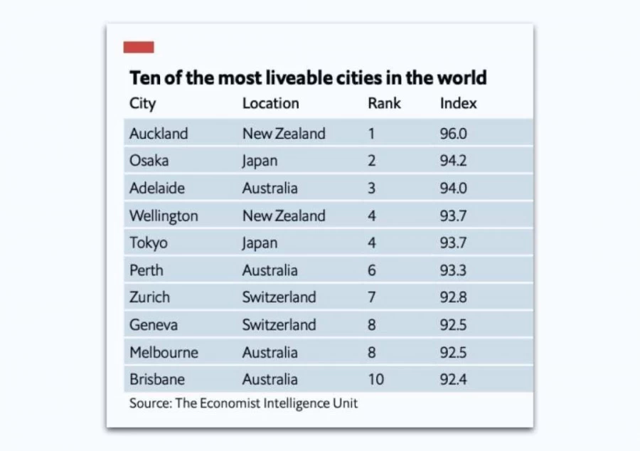 68.6 के औसत स्कोर के साथ, एशिया प्रशांत क्षेत्र के शहरों ने महामारी शुरू होने से पहले दर्ज किए गए औसत 73.09 से नीचे स्कोर किया। द इकोनॉमिस्ट इंटेलिजेंस यूनिट (द ईआईयू) ग्लोबल लिवेबिलिटी रैंकिंग के 2021 संस्करण में पाया गया है कि ऑकलैंड दुनिया का सबसे रहने योग्य शहर है। रैंकिंग के शीर्ष पर एपीएसी क्षेत्र में शहरों की एक मजबूत टुकड़ी है, जिसमें ओसाका, एडिलेड, टोक्यो और वेलिंगटन शीर्ष पांच में शामिल हैं।
