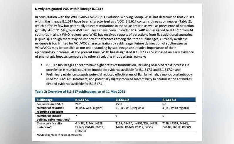 भारत के बाहर ब्रिटेन में सबसे ज्यादा इस वेरिएंट के मामले सामने आए हैं। इस सप्ताह के शुरू में WHO ने B.1.617 की घोषणा की- जो कि अपने म्यूटेशन और विशेषताओं के कारण "चिंता का एक प्रकार" के रूप में गिना जाता है। इसलिए इसे पहली बार ब्रिटेन, ब्राजील और दक्षिण अफ्रीका में कोविड -19 के तीन अन्य वेरिएंट वाली सूची में जोड़ा गया था।