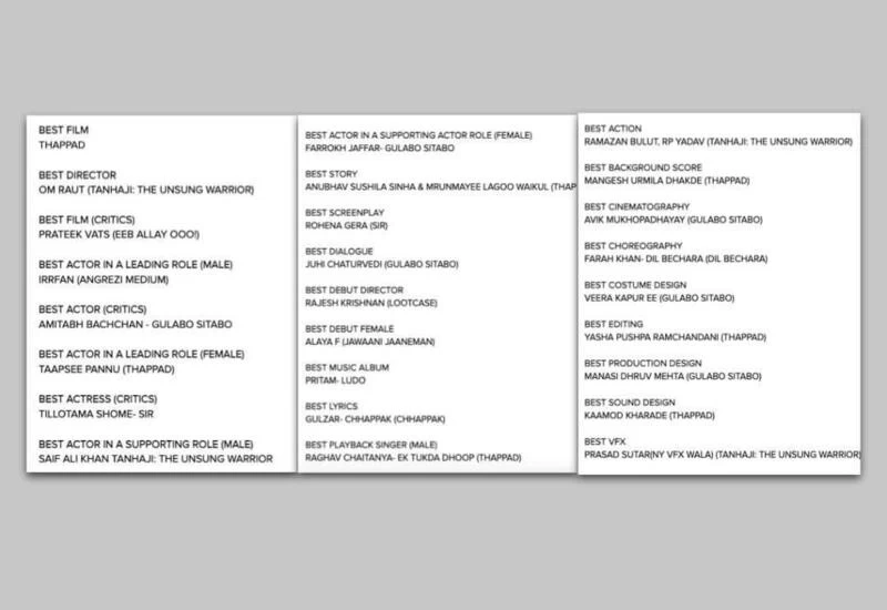 बेस्ट प्लेबैक सिंगर (पुरुष): थाप्पड़ की ‘एक टुकडा धोप’ के लिए राघव चैतन्य और बेस्ट प्लेबैक सिंगर (फीमेल): ‘मलंग’ टाइटल ट्रैक के लिए असीस कौर