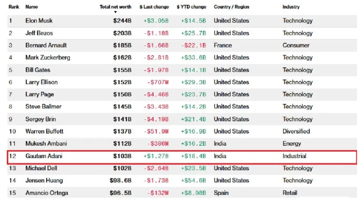 If we leave out Elon Musk, then Gautam Adani is the only billionaire in the list of top 20 billionaires whose wealth has increased. Otherwise, Jeff Bezos, Warren Buffet, Bill Gates, Steve Ballmer, Mark Zuckerberg, all saw a decline in wealth, even Mukesh Ambani's net worth saw a decline. According to the data, Gautam Adani's wealth has seen an increase of $ 1.27 billion. After which his wealth has become $ 103 billion. In the current year, his net worth has seen an increase of $ 18.4 billion.Took a long leapWith this speed, Gautam Adani has jumped two places. He has moved from the 14th richest billionaire in the world to the 12th richest businessman ranking. He has left behind Michael Dell and Jensen Huang. Whose wealth has seen a big decline. Jensen Huang is now out of the elite list of $ 100 billion. His net worth has come down to $ 98.6 billion. On Thursday, his wealth saw a decline of $ 1.73 billion. However, this year his net worth has seen an increase of $ 54.6 billion. Which is the highest among the world's billionaires.Can leave Mukesh Ambani behindOn the other hand, Gautam Adani can soon leave his compatriot Mukesh Ambani behind and become Asia's richest businessman. However, there is still a difference of about $ 8 billion in the wealth of both. But in the last one week, Mukesh Ambani's wealth has seen a decline of $ 7 billion. This is being seen due to the decline in the shares of Reliance Industries. Right now the decline in Reliance shares is continuing, which can continue in the coming days as well. In such a situation, Mukesh Ambani's wealth can be seen declining. On the other hand, if Adani continues to move forward like this, he can leave Mukesh Ambani behind. Currently, Mukesh Ambani's net worth is $112 billion. On Friday, his net worth saw a decline of $386 million. However, currently, his wealth can see an increase of $16.2 billion.Only Musk and Adani could do this featIf you look at the Bloomberg Billionaires data, you will see very interesting figures. According to Bloomberg data, only Elon Musk and Gautam Adani's wealth has seen an increase of more than $1 billion. An increase of 700 million or more has been seen in the net worth of only 3 billionaires. An increase of more than $600 million has also been seen in the wealth of only 3 billionaires. At the same time, an increase of more than $500 million was also seen in the net worth of 3 billionaires. Apart from this, an increase of more than 400 million dollars has been seen in the wealth of 4 billionaires, an increase of more than 300 million dollars in the wealth of 5 billionaires and an increase of more than 200 million dollars in the wealth of 17 billionaires.On the other hand, there were 16 billionaires whose wealth saw a decline of more than one billion dollars. Out of which, a decline of more than 3 billion dollars has been seen in the wealth of 3 billionaires. Out of these 16 billionaires, a decline of more than 2 billion dollars and less than 3 billion dollars has been seen in the net worth of 4 billionaires. A decline of less than 2 billion dollars and more than one billion dollars has been seen in the wealth of 9 billionaires.
