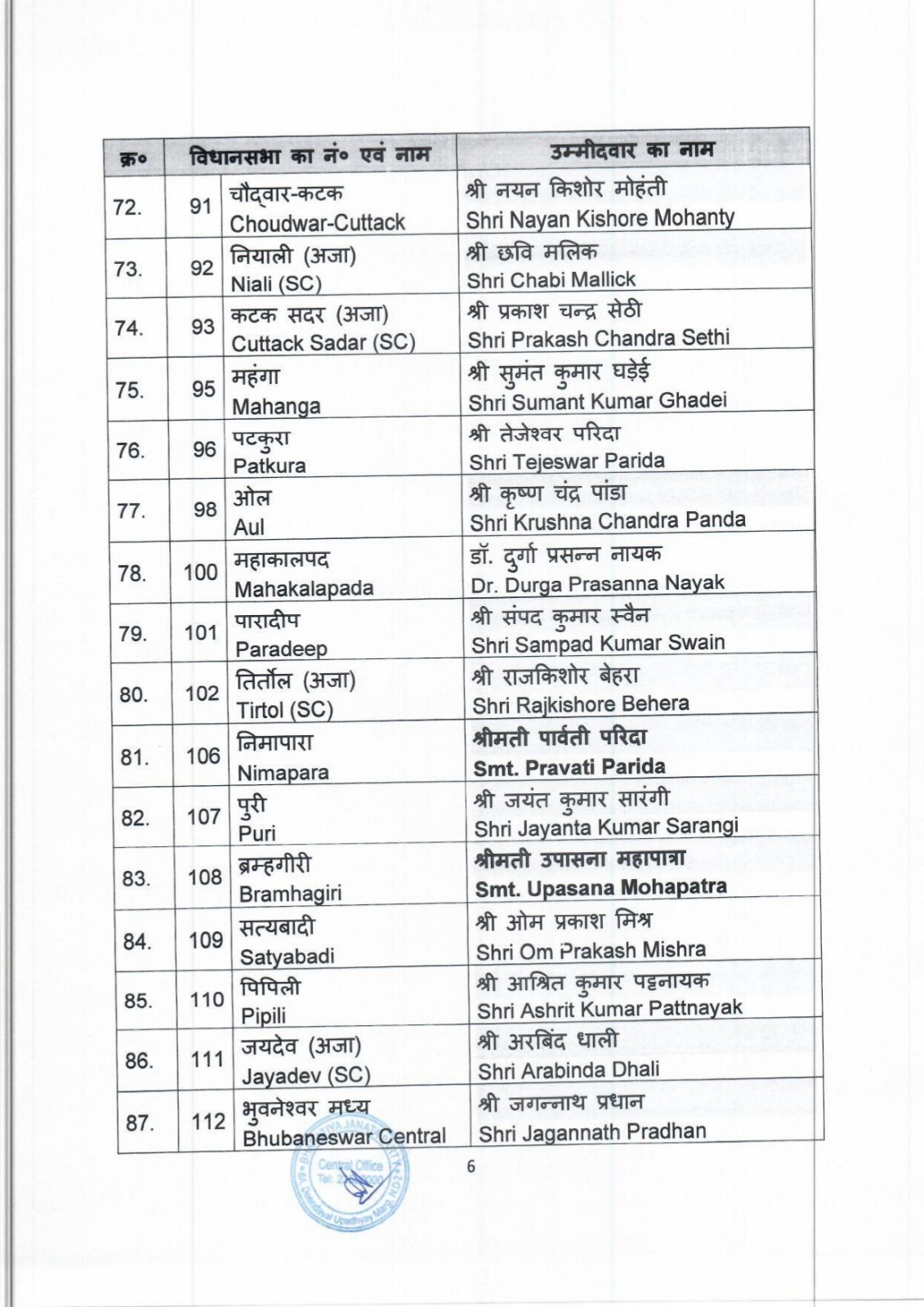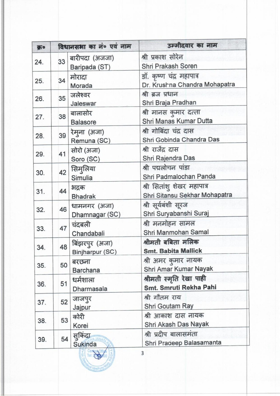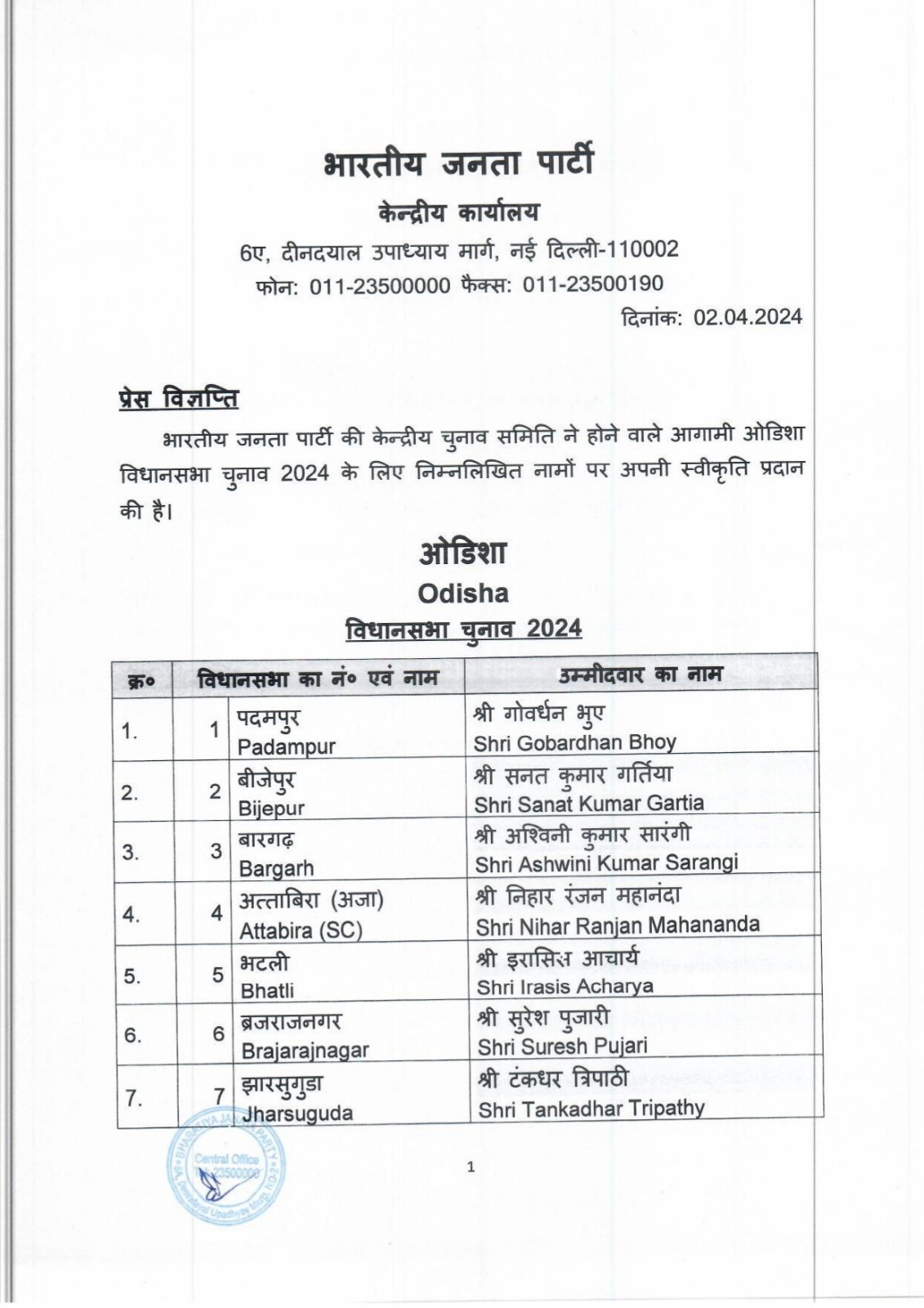 Odisha Assembly Election: Along with the Lok Sabha elections 2024, Odisha Assembly elections are going to be held. Today BJP has released the list of its candidates for 112 seats in the state. In this list, BJP has made Govardhan Bhuye the candidate of Padampur. At the same time, Sanat Kumar has been given a chance from Bijepur. For information, let us tell you that voting for Odisha Assembly elections is to be held in 4 phases. The first phase is starting on May 23, in which voting is to be held on 28 assembly seats.Announcement of names of 112 candidatesBJP has today announced the names of its candidates for 112 seats. Apart from Govardhan Bhuye, Sanat Kumar, Ashwini Kumar Sarangi from Bargarh has been given a chance in this list. At the same time, Nihar Ranjan Mahananda from Attabira (SC), Erasis Acharya from Bhatli, Suresh Pujari from Brajrajnagar and Tankadhar Tripathi from Jharsuguda have been fielded. Check the list below to see the names of other BJP candidates...