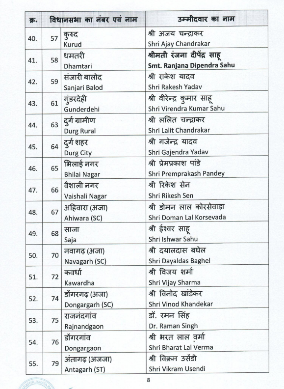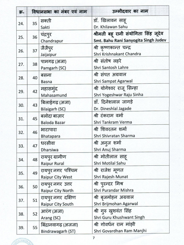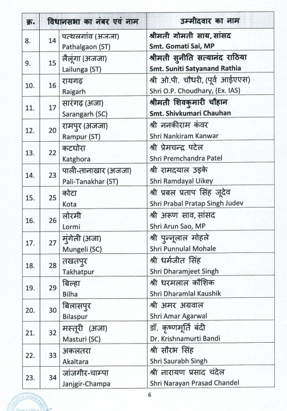 Who got the ticket from where?In view of Chhattisgarh Assembly elections, BJP has made MP Renuka Singh its candidate from Bharatpur-Sonhat seat. MP Gomati Sai is the assembly candidate from Pathalgaon. MP Arun Sav has been elected candidate from Lormi assembly seat. Talking about other candidates, Raman Singh has been made the candidate from Rajnandgaon. Vijay Sharma has been made the candidate from Kawardha seat. While Bharatlal Verma will contest from Dongargaon, Vikram Usendi will contest from Antagarh. Shyam Bihari Jaiswal from Manendragarh, Bhaiyalal Rajwade from Baikunthpur, Udheshwari Paikra from Samari, Ram Kumar Toppo from Sitapur, Raimuni Bhagat from Jashpur, Vishnu Dev Sai from Kunkuri, Suniti Satyanand Rathiya from Lailunga, retired IAS OP Chaudhary from Raigarh, Shivkumari Chauhan from Sarangarh. BJP has made Nankiram Kanwar its candidate from Rampur.Whereas Premchandra Patel from Katghora, Ramdayal Uike from Pali-Tanakhar, Prabal Pratap Singh Judev from Kota, Arun Sao from Lormi, Punnulal Mohle from Mungeli, Dharamjit Singh from Takhatpur, Amar Aggarwal from Bilaspur, Narayan Prasad Chandel from Janjgir-Champa, Mahasamund from Yogeshwar Raju Sinha, Shivratan Sharma from Bhatapara, Motilal Sahu from Raipur Rural, Rajesh Munat from Raipur Nagar West, Purandar Mishra from Raipur Nagar North, Brijmohan Agarwal from Raipur Nagar South, Lalit Chandrakar from Durg Rural, Gajendra Yadav from Durg City, Bhilai Nagar BJP has made Prem Prakash Pandey from Jagdalpur, Kiran Singh Dev from Jagdalpur, Chetram Arami from Dantewada as its candidate.