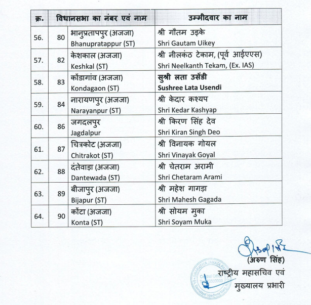 Chhattisgarh Election: The dates of assembly elections to be held in 5 states of the country have been announced. In view of Chhattisgarh Assembly elections, Bharatiya Janata Party has released the first list of names of its candidates. This list has been released by BJP's national general secretary and headquarters in-charge Arun Singh. Let us tell you that BJP has just announced its candidates on 64 seats. Let us tell you that in this list released by BJP, many BJP MPs have also been given tickets. These names also include the names of MPs like Renuka Singh and Gimati Sai.