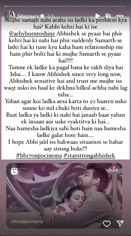 Bigg Boss 17: There have been many scenes in the house due to Isha Malviya's love angle in Bigg Boss-17 last week. However, while the contestants were seen clashing with each other earlier this week, the commotion has increased further with the nomination task. In the recently released promo, Isha Malviya's ex-boyfriend Abhishek Kumar has nominated her current boyfriend Samarth Jurel. The atmosphere of the house will once again be seen changing due to the fight between the two. However, meanwhile, TV actress Falak Naz has supported Abhishek Kumar by posting on social media.Falak Naz, who was a part of Bigg Boss OTT-2, has shared a long post on Instagram. During this time, actress Isha was also seen getting angry at Malviya. Let us tell you that while everyone is raising questions on Isha Malviya regarding her love angle, some celebs have also been seen supporting her.Why did Falak get angry at Isha Malviya?Actually, TV actress Falak Naz has raised questions about the behavior of Bigg Boss 17 contestant Isha Malviya. The actress shared a story on Instagram and wrote, I can't understand what is the problem of this girl? Sometimes she says that she loves Abhishek. Then she says that she is not and suddenly fights with Samarth asking why did you say that we are in a relationship, then she says that I love Samarth.