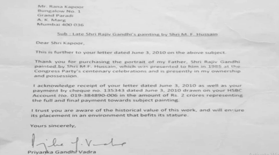 Rana Kapoor, the former CEO of Yes Bank, in his statement to the ED, told how by pressurizing him and luring him to get Padma Bhushan, he kept MF with Priyanka Gandhi. There was pressure to buy Husain's painting for 2 crores. After this, Priyanka Gandhi also thanked Rana Kapoor by writing a letter to buy the painting.Priyanka Gandhi wrote a letter to Rana KapoorLet us tell you that after buying the painting, Priyanka Gandhi wrote a letter on June 4, 2010, expressing her gratitude to Rana Kapoor. Priyanka Gandhi wrote in the letter that thank you for buying the painting of my late father made by MF Hussain! This painting was gifted to my father during the Congress Party Centenary Celebration in 1985, which was presently with me. On 3rd June 2010, payment was received from your letter as well as check number 135343. I am sure you are aware of the historical value of this work.This was revealed in the interrogation of ED