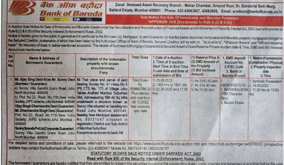 Sunny Deol's house is being auctioned'Gadar 2' actor Sunny Deol's Juhu villa is up for auction. The name of this villa is Sunny Villa. It is being told that Sunny Deol has a debt of Rs 55 crore. His Sunny Villa is being auctioned by Bank of Baroda for recovery of this loan and interest. The date of the auction has also come to the fore, whose ad is also being given in the newspapers. Accordingly, the auction will start on September 25 at a reserve price of Rs 51.43 crore.Sunny Deol's name is written in the advertisementThe advertisement surfaced named Ajay Singh Deol alias Sunny Deol as the borrower/guarantor. This residence named Sunny Villa is located on Gandhi Gram Road in Juhu, North Mumbai. India TV tried to get in touch with Sunny Deol and his team, but is yet to hear from them. The actor is currently promoting his film 'Gadar 2' in Dubai. It is being told that after this he is preparing to go to London.Sunny Deol has talked about difficultiesSunny Deol has spoken openly about his days of struggle on many occasions. Earlier also he had revealed that he was struggling to get support from the big names of the film industry while launching Bobby Deol. He said that no filmmaker was ready to cast Bobby. Apart from this, after many films flopped continuously, the matter of huge debt also came to the fore.People are liking Sunny's filmLet me tell you, on August 11, Sunny Deol's most awaited film 'Gadar 2' was released in theatres. The film is getting good response. Makers and Sunny Deol started promoting the film long back. After 22 years, people were eagerly waiting to see the second part of 'Gadar'.However, till now no reaction has been revealed from Sunny Deol's side on this news. While talking about Gadar 2, Sunny Deol has got the biggest hit film of his career so far. OMG 2 has also been left behind in front of Gadar 2's storm. Sunny Deol is very happy with the success of the film. Even the makers are not happy to see the tremendous earnings of the film.