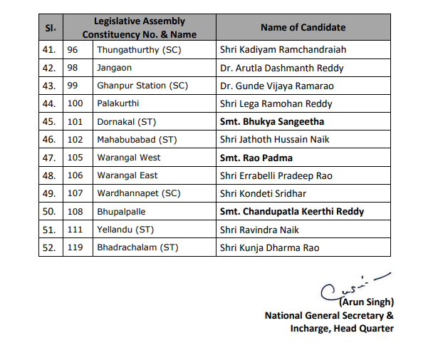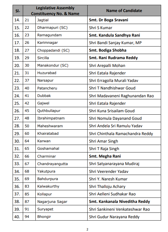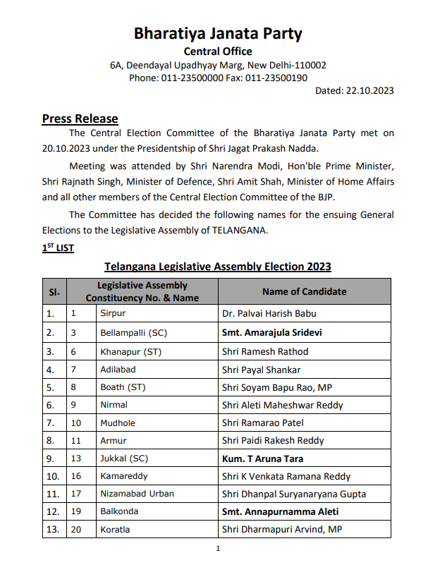 कैंडिडेट की अपनी पहली लिस्ट में पार्टी ने तीन सांसदों को टिकट दिया है, जिसमें अरविंद धर्मपुरी, सोयम बापू राव, बंदी संजय कुमार शामिल हैं. बीजेपी तेलंगाना में जेएसपी के साथ गठबंधन में चुनाव लड़ रही है. जेएसपी प्रमुख पवन कल्याण ने शहरी क्षेत्रों में सीटों मांगा था, लेकिन किशन रेड्डी और सांसद लक्ष्मण ने सुझाव दिया कि जेएसपी ग्रामीण क्षेत्रों में अपने उम्मीदवार उतारे, खासकर उन निर्वाचन क्षेत्रों में जहां कम्मा मतदाता महत्वपूर्ण प्रभाव रखते हैं.जेएसपी के खाते में आई ये सीटेंमाना जाता है कि जेएसपी को बीजेपी के साथ सीट-बंटवारे की व्यवस्था के तहत वायरा, मधिरा, खम्मम, कोठागुडेम, असवाराओपेट, पलैर, सथुपल्ली, येल्लंधु, कुकटपल्ली, नाकरेकल, कोडाद और पालकुर्थी में सीटें दी गई हैं. आगामी चुनावों में, बीजेपी राज्य चुनाव प्रबंधन समिति के अध्यक्ष इटेला राजेंदर, गजवेल और हुजूराबाद दोनों निर्वाचन क्षेत्रों से चुनाव लड़ेंगे. इटेला राजेंदर ने पहले ही ऐलान किया था कि वह अपनी हुज़ूराबाद सीट के अलावा केसीआर के खिलाफ भी चुनाव लड़ेंगे. केसीआर खुद भी इस बार दो सीट से चुनाव लडं रहे हैं. मौजूदा सीट गजवेल और कामारेड्डी सीट से भी वह मैदान में उतर रहे हैं. करीमनगर के सांसद और बीजेपी महासचिव बंदी संजय भी करीमनगर विधानसभा क्षेत्र से चुनाव लड़ेंगे.बीजेपी की पहली लिस्ट में 12 महिला उम्मीदवारबीजेपी की पहली लिस्ट में 12 महिला उम्मीदवार भी हैं, जिन्हें प्रमुख निर्वाचन क्षेत्रों के लिए चुना गया है. पूर्व टीडीपी विधायक अन्नपूर्णम्मा को बालकोंडा निर्वाचन क्षेत्र के लिए चुना गया है. बीजेपी के कद्दावर नेता चंदूपतला जंगा रेड्डी की बहू चंदूपतला कीर्ति रेड्डी भूपालपल्ली से उम्मीदवार हैं. प्रदेश अध्यक्ष जी किशन रेड्डी, पार्टी के राज्य चुनाव प्रभारी प्रकाश जावड़ेकर और बीजेपी तेलंगाना प्रभारी सुनील बंसल सहित प्रमुख बीजेपी नेताओं ने चयनित उम्मीदवारों को बधाई देने के लिए फोन पर बात भी की है. इन उम्मीदवारों से अपने संबंधित क्षेत्रों में चुनाव प्रचार में जुटने कहा गया है.