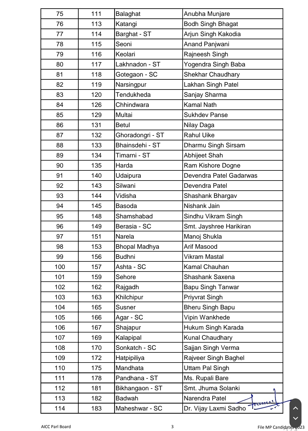 मप्र विधानसभा चुनाव के लिए कांग्रेस ने अपने उम्मीदवारों की पहली सूची जारी कर दी है। इसमें 144 सीटों पर नामों की घोषणा की है। दिल्ली में ऑल इंडिया कांग्रेस कमेटी के दफ्तर में केंद्रीय चुनाव समिति की बैठक में यह निर्णय लिया गया। कांग्रेस ने अपने एक्स (ट्विटर) अकाउंट पर इसकी जानकारी दी है। कांग्रेस ने अपनी पहली लिस्ट में पुराने चेहरों पर दांव लगाया है। छत्तीसगढ़ में कांग्रेस के 30 उम्मीदवारों की लिस्ट...