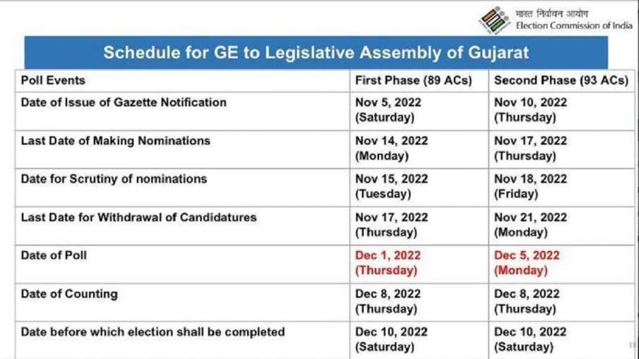 Gujarat Election Date: चुनाव आयोग ने गुजरात में होने वाले विधानसभा चुनावों की तारीखों का ऐलान कर दिया है। यहां 1 और 5 दिसंबर को वोटिंग होगी और 8 दिसंबर को वोटों की काउंटिंग की जाएगी। इस मौके पर दिल्ली में मुख्य चुनाव आयुक्त राजीव कुमार ने कहा, 'मुझे बताते हुए खुशी हो रही है कि गुजरात विधानसभा चुनाव में 3,24,422 नए वोटर इस बार पहली बार वोट डालेंगे। कुल वोटिंग सेंटर की संख्या 51,782 है। राज्य में स्थापित वोटिंग सेंटरों में से कम से कम 50% वोटिंग केंद्रों पर वेबकास्टिंग की व्यवस्था होगी।' इस बार महिलाओं के लिए भी 1274 पोलिंग बूथ बनाए जाएंगे और चुनाव में शिपिंग कंटेनर का बूथ की तरह इस्तेमाल होगा। इसमें 142 मॉडल वोटिंग केंद्र बनाए जाएंगे। इसके अलावा चुनाव आयोग ने अपनी प्रेस कॉन्फ्रेंस की शुरुआत में मोरबी हादसे पर भी दुख जताया। 2 चरणों में होगा गुजरात विधानसभा का चुनाव गुजरात विधानसभा का चुनाव 2 चरणों में होगा। पहला चरण एक दिसंबर और दूसरा चरण 5 दिसंबर को होगा। वोटों की काउंटिंग 8 दिसंबर को होगी। बता दें कि पिछली बार साल 2017 में भी गुजरात में 2 चरणों में ही चुनाव हुआ था। इसके लिए वोटिंग 9 दिसंबर और 14 दिसंबर 2017 को हुई थी। इसमें बीजेपी ने कुल 99 सीटों पर कब्जा किया था। वहीं कांग्रेस के खाते में 77 सीटें और अन्य पार्टियों को 6 सीटें मिली थीं।ये हैं दोनों चरणों के चुनाव की अहम तारीखें