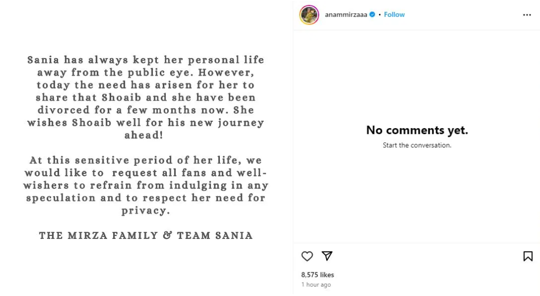 अनम मिर्ज़ा ने जारी किया बयानअनम मिर्ज़ा के बयान में आगे लिखा गया है कि सानिया की जिंदगी के इस भावुक पल में हम उनके साथ हैं, हम सभी फैन्स और चाहने वालों से अपील करते हैं कि किसी भी तरह की अटकलें ना लगाएं और निजता का सम्मान बनाएं रखें. मिर्ज़ा परिवार और टीम सानिया की ओर से अपील.’बता दें कि सानिया मिर्ज़ा और शोएब मलिक की शादी साल 2010 में हुई थी. दोनों का रिश्ता करीब 14 साल तक चला, पिछले कुछ वक्त से ही दोनों अलग रह रहे थे और तलाक की अटकलें लगातार चल रही थीं. इस बीच शोएब मलिक की शादी की खबर सामने आई, शोएब मलिक ने पाकिस्तानी अदाकारा सना जावेद से निकाह किया है. सानिया और शोएब का एक बेटा इज़हान भी है, जो तलाक के बाद दुबई में ही रहेगा.
