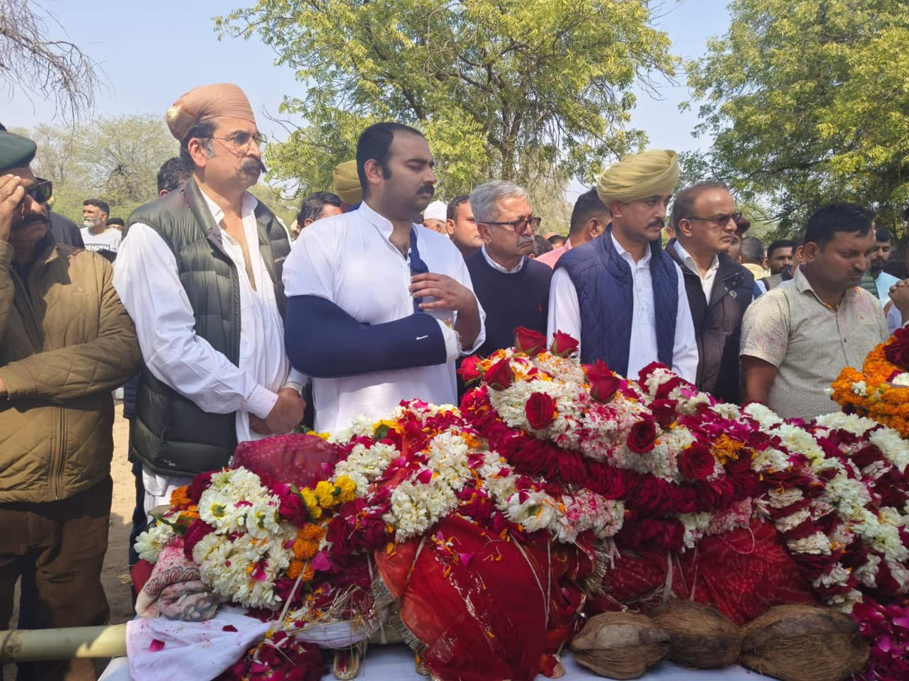 Jodhpur News: राजस्थान के बाड़मेर जैसलमेर के पूर्व सांसद मानवेंद्रसिंह जसोल की पत्नी चित्रासिंह का बीते मंगलवार को अलवर में एक सड़क हादसे में निधन हो गया, जिसके बाद बुधवार को शव जोधपुर लाया गया. वहीं, आज उनका पाबूपुरा में स्थित फार्म हाउस में अंतिम संस्कार हुआ. वहीं, उनके अंतिम दर्शन के लिए जसोल के निवास पर काफी संख्या में लोग पहुंचें. मुख्य सचेतक जोगेश्वर गर्ग, विधायक प्रतापपुरी, रविन्द्र सिंह भाटी,पूर्व विधायक मदन प्रजापत सहित कई प्रबुद्धजनों के श्रद्धांजलि दी. जोधपुर उनका शव पहुंचने के बाद उनके निवास पर परिजनों के अलावा परिचितों के पहुंचने का सिलसिला शुरू हो गया था. वहीं, उनकी बेटी इटली से जोधपुर आई थी.
