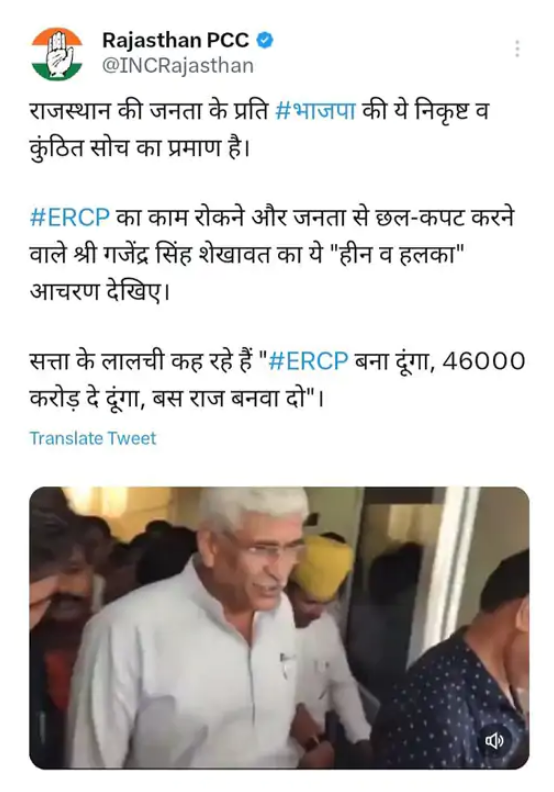 शेखावत ने बीजेपी राज की जगह राठौड़ का राज लाने की बात कहकर सियासी चर्चा छेड़ीशेखावत ने बीजेपी राज की जगह राजेंद्र राठौड़ का राज लाने की बात कहकर सियासी चर्चाएं छेड़ दी हैं। शेखावत ने राठौड़ को इशारों में मुख्यमंत्री का दावेदार बता दिया। अब तक बीजेपी के नेता मोदी के चेहरे पर ही चुनाव लड़ने की बात कहते रहे हैं। केंद्रीय मंत्री ने मजाक में ही सही, लेकिन राठौड़ को सीएम उम्मीदवार बता दिया।कांग्रेस ने शेखावत पर निशाना साधाशेखावत का वीडियो सोशल मीडिया पर खूब शेयर किया जा रहा है। राजस्थान कांग्रेस ने केंद्रीय मंत्री के वीडियो को अपने ऑफिशियल ट्विटर हैंडल पर शेयर करते हुए बीजेपी और शेखावत पर निशाना साधा है। कांग्रेस ने लिखा- राजस्थान की जनता के प्रति भाजपा की ये निकृष्ट और कुंठित सोच का प्रमाण है।ERCP का काम रोकने और जनता से छल-कपट करने वाले शेखावत का ये 'हीन व हलका' आचरण देखिए। सत्ता के लालची कह रहे हैं, ERCP बना दूंगा, 46000 करोड़ दे दूंगा, बस राज बनवा दो।सोशल मीडिया यूजर्स ने किए तल्ख कमेंटकांग्रेस के अलावा सोशल मीडिया यूजर्स भी अलग&अलग कमेंट कर रहे हैं। संजय मेहरा ने लिखा- विपक्ष का असली चेहरा। जनता की सुविधा&असुविधा से इनको मतलब नहीं सिर्फ सत्ता से मतलब हैlभुवनेश ने लिखा- लालच और कुंठा से ग्रसित बीजेपी और बीजेपी के नेता जनता से इन्हें कोई सरोकार नहीं है। मनीष अरोड़ा ने लिखा- केंद्र सरकार की रीति-नीति में फर्क है। रिंकू मीणा ने लिखा- सत्ता के लालची कह रहे हैं ERCP बना दूंगा, 46000 करोड़ दे दूंगा, बस राज बनवा दो।गुर्जर नेता हिम्मत सिंह बोले- सत्ता के लालची लोगों को जनता गांवों में नहीं घुसने देगीगजेंद्र सिंह के वीडियो पर गुर्जर नेता हिम्मत सिंह ने पलटवार किया है। हिम्मत सिंह ने ट्वीट करके और लिखित बयान जारी करके बीजेपी और गजेंद्र सिंह पर निशाना साधा। हिम्मत सिंह ने कहा- ERCP को अटकाने वाले आज साफ कह रहे हैं कि इनको बस सत्ता चाहिए, जनता से मतलब नहीं। बोल भी ऐसे रहे हैं, जैसे पैसा अपनी जेब से देंगे।पूर्वी राजस्थान की जनता के प्रति भाजपा की ये निकृष्ट और कुंठित सोच का प्रमाण है। ईआरसीपी का काम रोकने और पूर्वी राजस्थान की जनता से छल-कपट करने वाले समझ लें-खुली आंखों से सपना देखना बंद कर दो जनता गांवों में नहीं घुसने देगी। ये सत्ता के लालची लोग हैं। इन्हें जनता से कोई हमदर्दी नहीं, किसानों के तो ये सबसे बड़े दुश्मन हैं। इन्हें सबक सिखाने के लिए प्रदेश की जनता तैयार है।