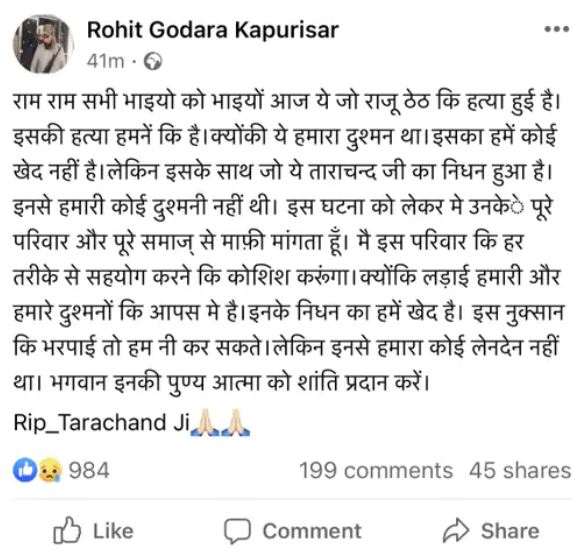 रोहित गोदारा ने ताराचंद की हत्या के लिए माफी मांगीट्विटर और फेसबुक पर पोस्ट कर राजू ठेहट की हत्या की जिम्मेदारी लेने वाले बीकानेर के गैंगस्टर रोहित गोदारा के नाम वाले फेसबुक अकाउंट से एक और पोस्ट की गई। पोस्ट में लिखा था- राजू ठेहट की हत्या का कोई खेद नहीं है, लेकिन इसके साथ ताराचंदजी का निधन हुआ, उसके लिए उनके पूरे परिवार और समाज से माफी मांगता हूं। मैं इस परिवार का हर तरह से सहयोग करने की कोशिश करूंगा। इनके निधन का हमें खेद है। इस नुकसान की भरपाई तो हम नहीं कर सकते।